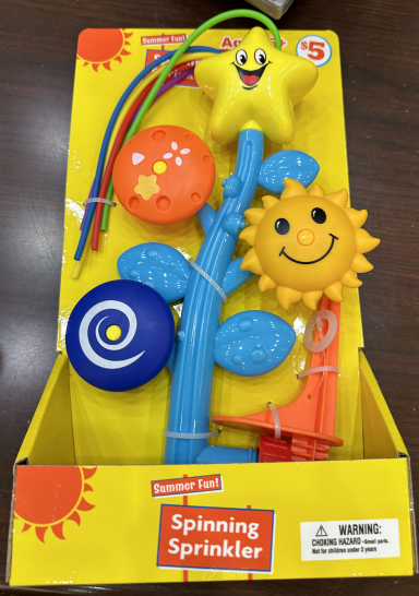 This rotating water sprinkler toy provides hours of outdoor fun! Connect it to a garden hose and watch it spin and spray water in all directions. A great way to cool off and enjoy the outdoors. Multi-colored.
