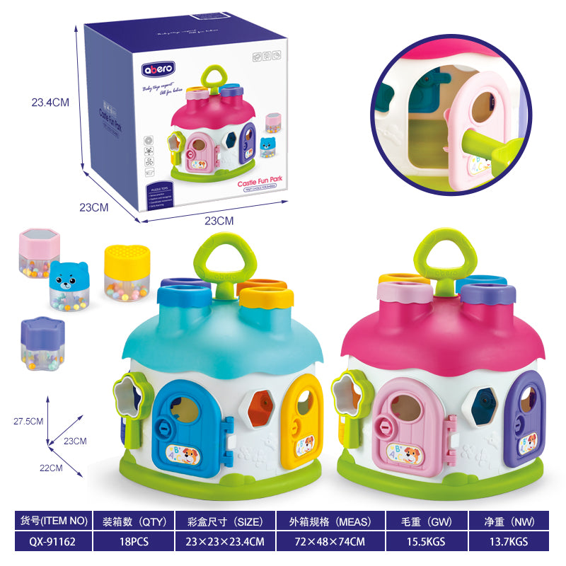 The colorful castle can easily attract the baby’s attention. With the smooth body free of burrs, it protects the baby’s tender skin. The baby learns the colors and shapes from the blocks. Then it can try to throw the corresponding blocks through the different chimneys. Take out the key to open or close the doors in different colors. Swing the blocks with the crisp sounds to delight the baby. This toy develops the baby’s logical thinking, observation, and motor skills.