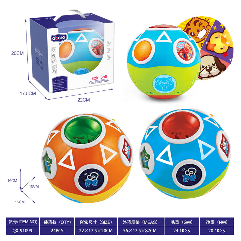 This ball spins along with vibrant music and dazzling lights. Pressing a button triggers corresponding sounds and music, and the ball continues to spin. The ball can switch to a World Cup theme mode, playing World Cup-related songs while the ball spins in sync with the music. Four animal sounds/music modes can be switched, helping babies learn animal identification and shapes.
